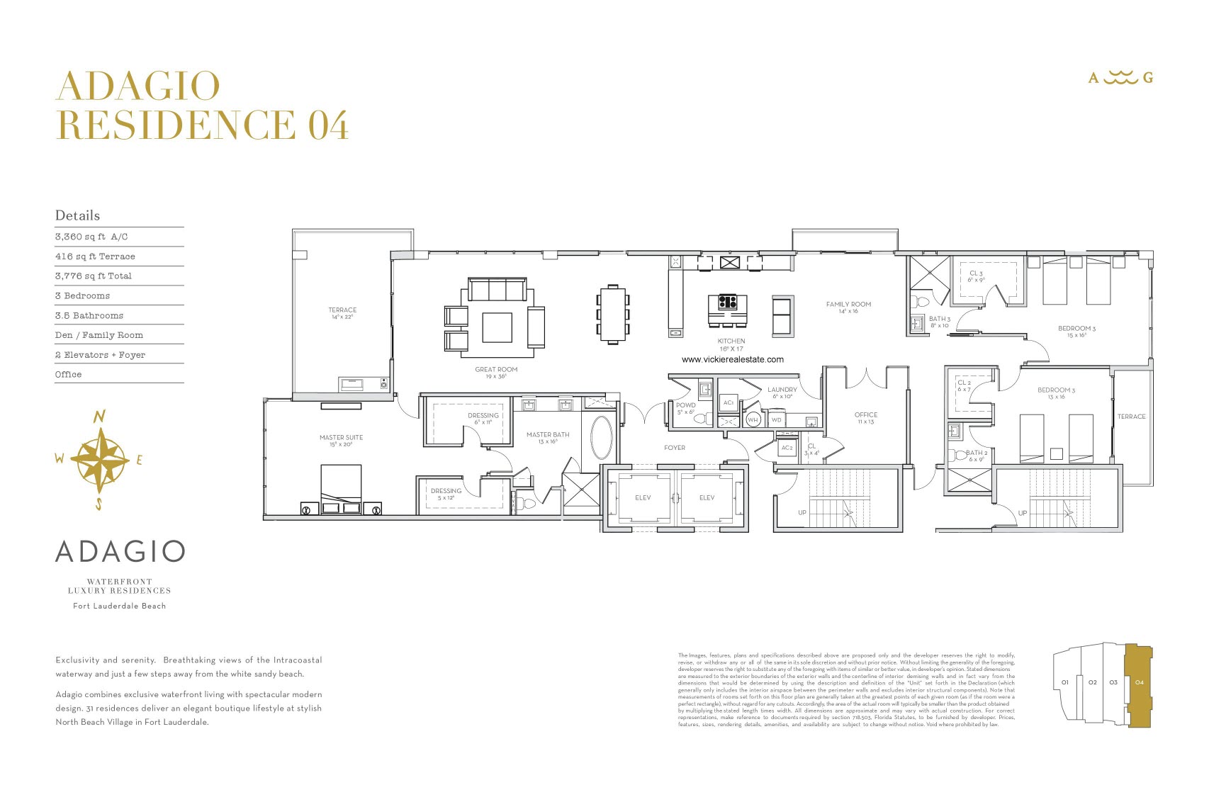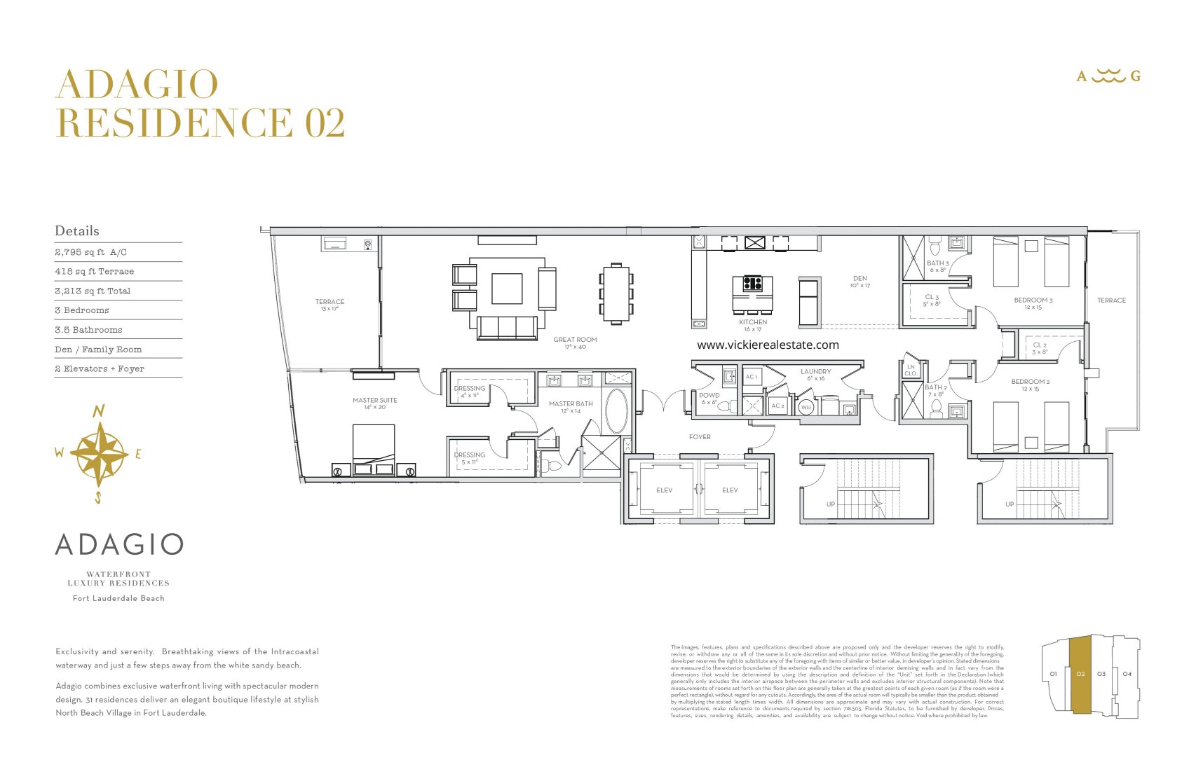 Spacious Residences each offer 3 Bedrooms and range in size from 2,423 – 3,360 Square Feet of Living Area with 380 – 463 Square Feet of Balconies/Terraces.